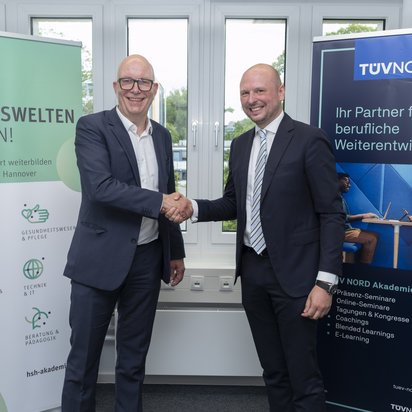 Roland Bursy, Geschäftsführer der TÜV NORD Akademie, und Prof. Martin Grotjahn, Vizepräsident der Hochschule Hannover für Forschung, Transfer, Entrepreneurship und Weiterbildung, unterzeichneten den Vertrag über die Zusammenarbeit. Die TÜV NORD Akademie erweitert dadurch ihr Schulungsangebot im Bereich der Wasserstofftechnologie, einschließlich Energie, Anlagentechnik und Sicherheit.