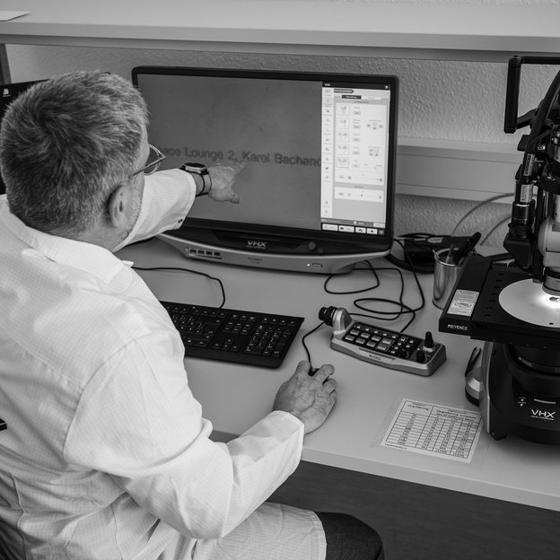 ALTER | HTV untersuchte mit optischer Mikroskopie und einem Rasterelektronenmikroskop, ob die Daten auf dem neuartigen Speichermedium auch auslesbar sind. Durch diese Untersuchungen haben die Expert:innen sicherstellen können, dass die nano-gravierten Analogdaten sichtbar sind und im Vergleich zu den Originalen, auch eine hohe Qualität liefern. ALTER | HTV ist darauf spezialisiert, elektronische Komponenten über eine Vielzahl von Analysemethoden zu prüfen.